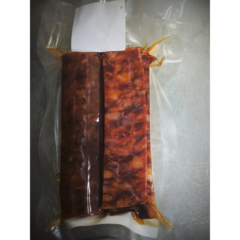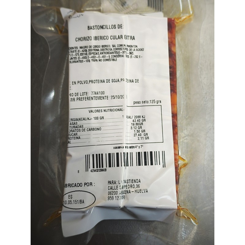Ingredients: lean Iberian pork, common salt, paprika, humectant (E-420), dextrin, dextrose, acidity regulators (R-325, E-575, E331iii), spices, antioxidants (E-301, E-392), EMULGENTS (E-450,E-452i-E-451-I)PRESERVATIVES (E-252, E-250, COLORING (E-120)Inedible casing