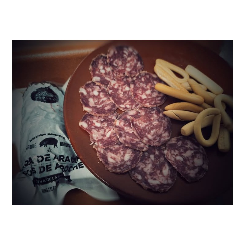 ingredientes:carne y grasa de cerdo iberico,sal,ajo,dextrina,dextrosa,proteina de cerdo, especias,vino,acidulante (acido citrico), antioxidante (E-301), conservadores(E-250 y E-252), colorante (E-120).Embutido en tripa natural , no comestible.Puede contener sulfitos