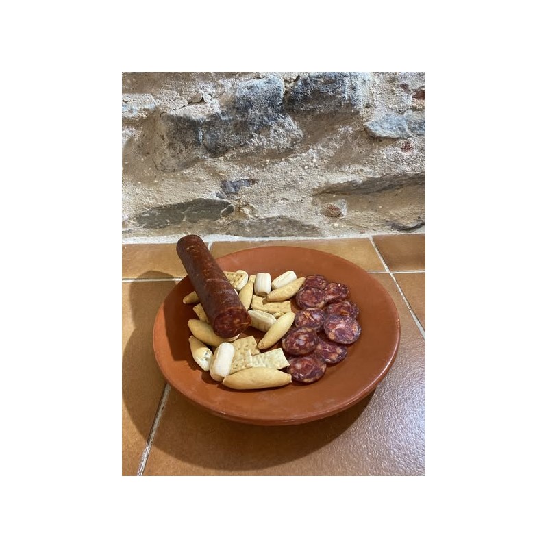 Elaborado con carne de cerdos Ibéricos alimentados a base de bellotas durante la montanera, especiadas con pimentón, ajo y especias, con la diferencia del cular por estar embutidos en tripa de menor calibre. Haciendo así su proceso de curación más corto y su textura jugosa y tierna.